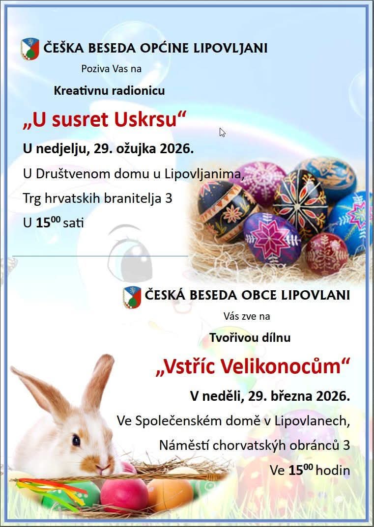Česka beseda općine Lipovljani upriličuje radionicu šaranja uskršnjih pisanica i prigodnih uskršnjih obićaja.